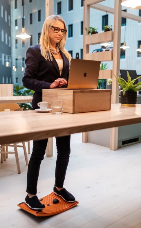 Ezzel az új szabadalmaztatott finn innovációs ergonómiai eszközzel a statikus állást dinamikussá tehetjük. Keresztirányú rugalmasságának köszönhetően lehetővé teszi a járáshoz hasonló mozgást egyhelyben.